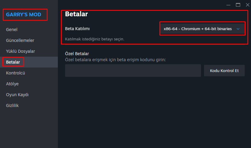 Çözüm 1 - Steame girip Gmod a sağ tıklayıp özelliklerden betalar kısmını bu şekilde yapıp kaydedip çıkın ve indirmenin bitmesini bekleyip oyuna tekrar girin.